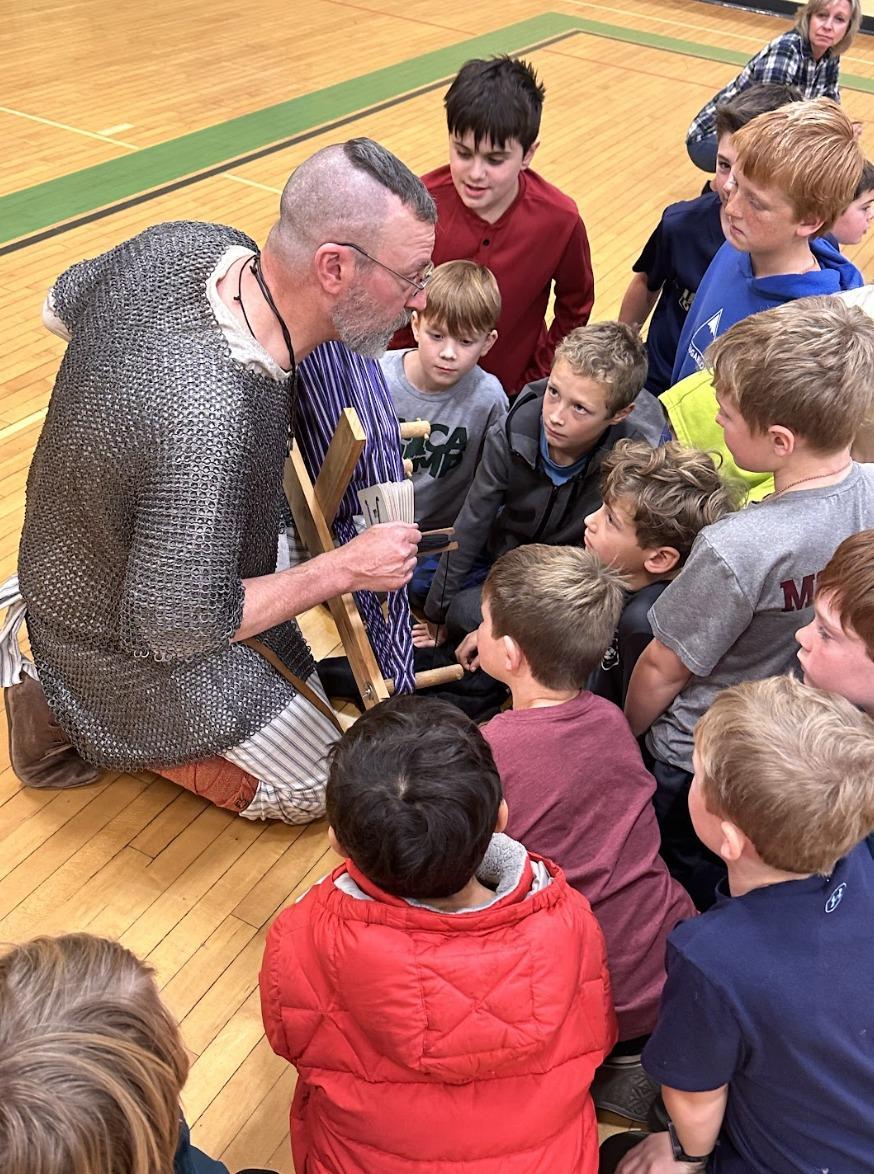 Man in chainmail engaging with an audience of children in a gymnasium.Fourth graders had guest speakers today from the Society for Creative Anachronism to extend their learning about the skills, arts, combat and culture of medieval times.